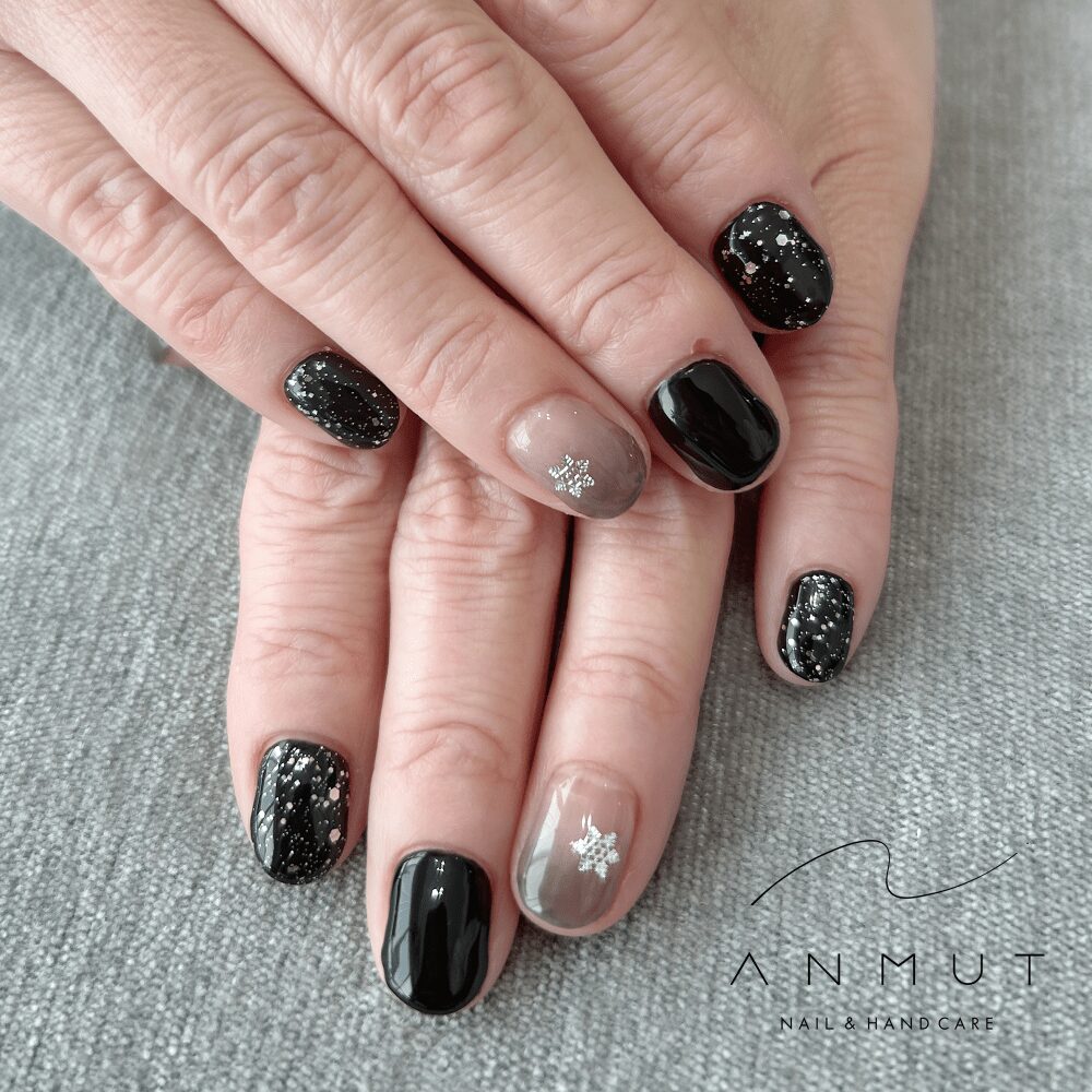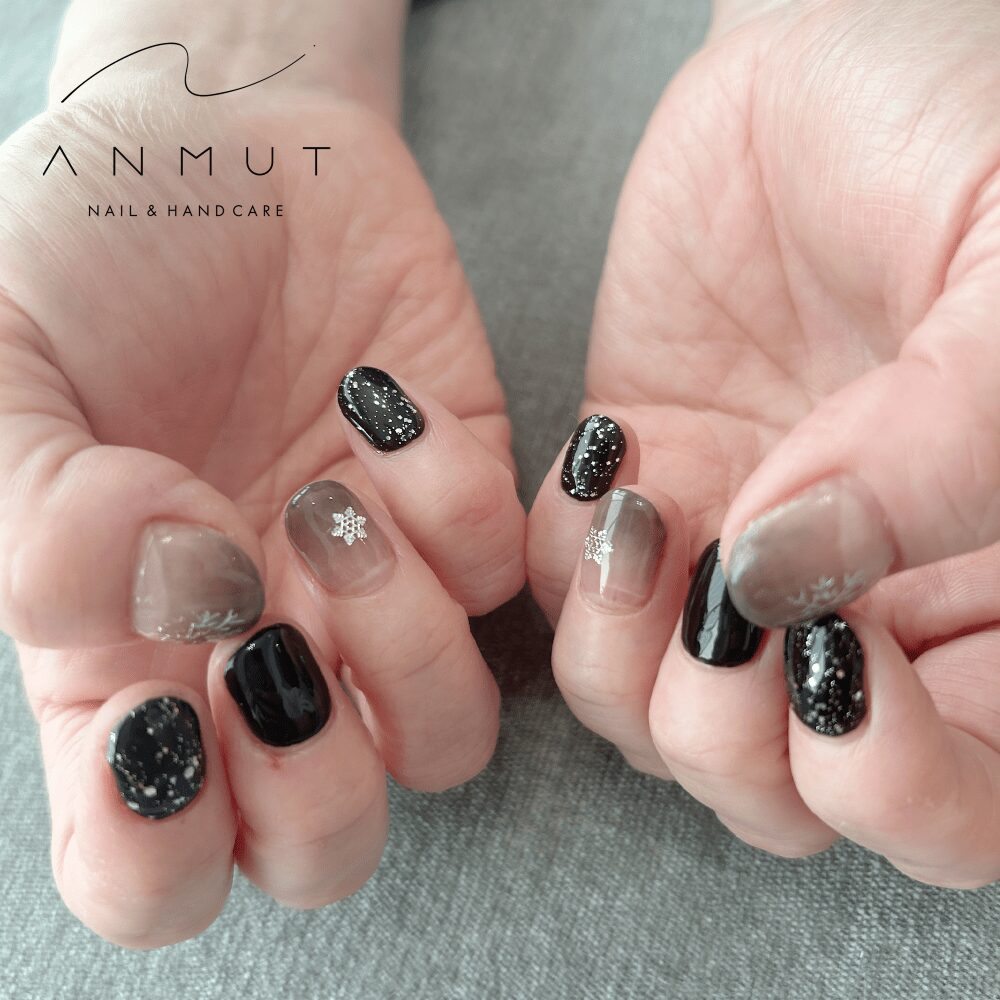 ダークベースのお色に雪の結晶は手書きのミラーアートで煌めきを